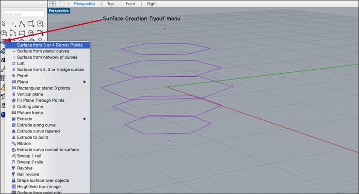 Use the Surface from three 0r 4 Corner Points command to map out the planes that will form the faceted hexagon.